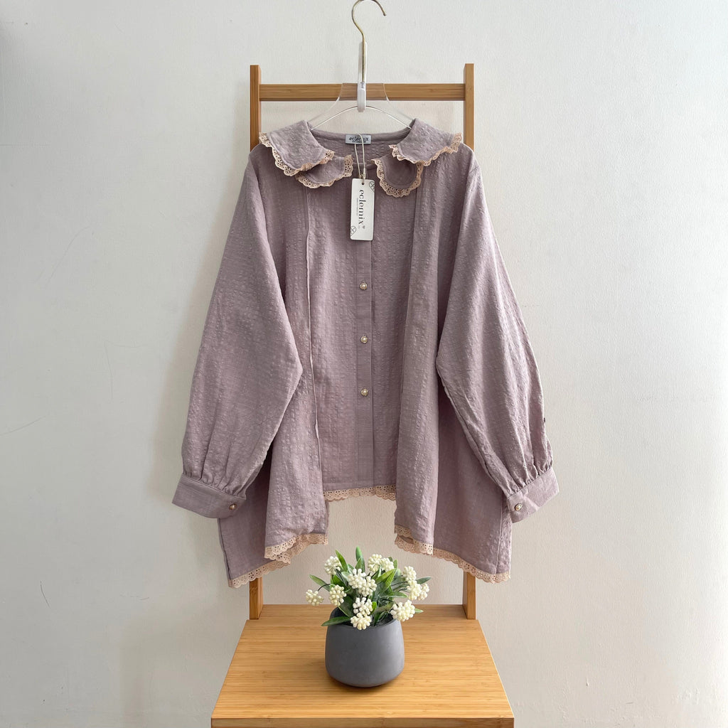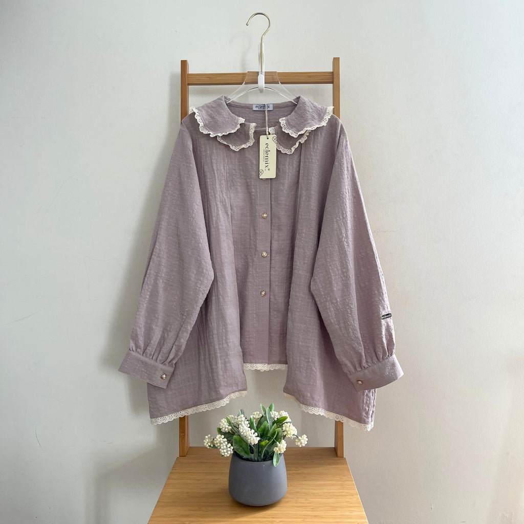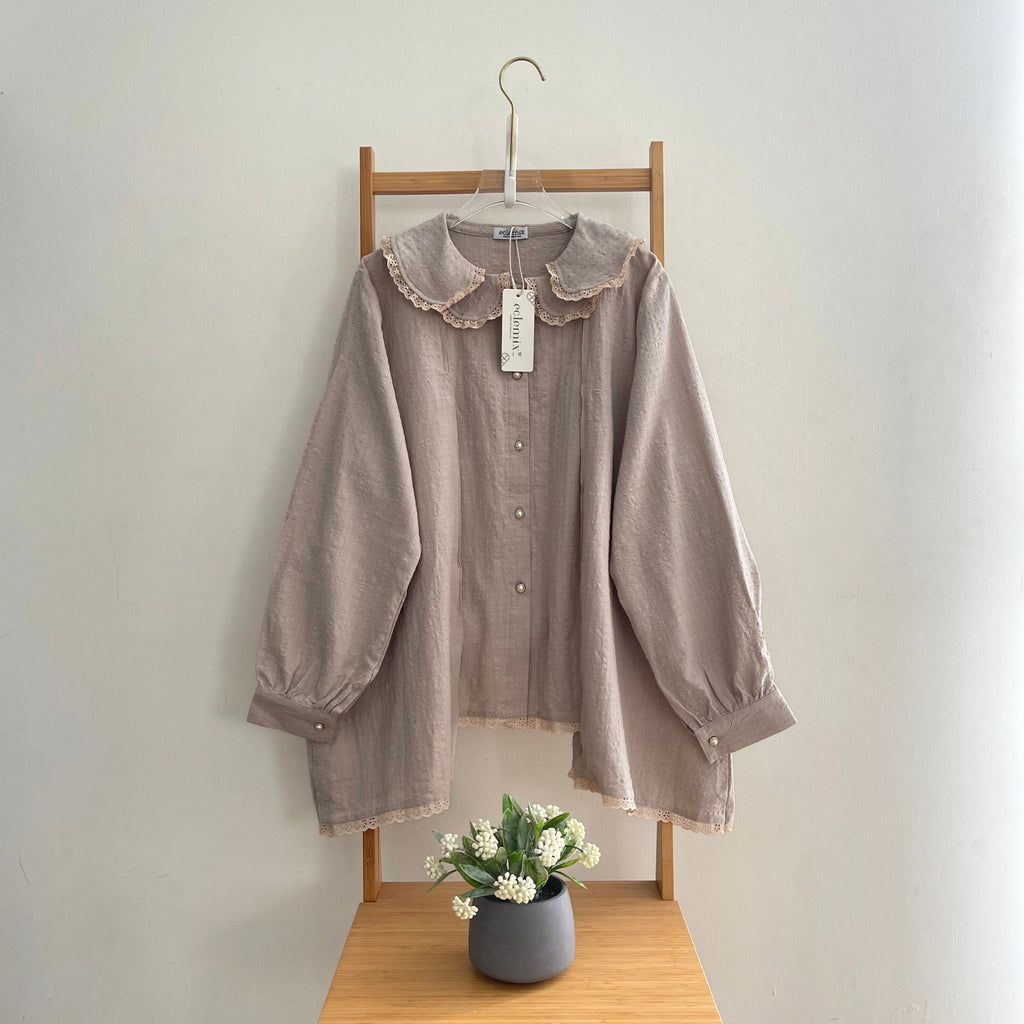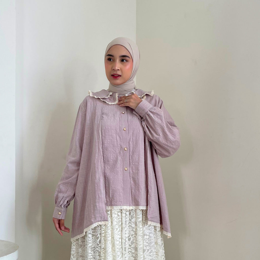 Hadir dengan desain longgar dan cuttingan flowy melebar yang nyaman dipakai, dilengkapi detail kerah bertumpuk beraksen renda yang memberi sentuhan manis dan vintage. Bagian depannya menggunakan bukaan kancing sederhana, bagian lengannya panjang dengan manset kancing adjustable yang klasik dan adjustable. Dihiasi renda pada bagian bawah, blouse ini membuat tampilan terlihat romantis dan feminin. Cocok dipadukan dengan celana kulot, rok, maupun jeans untuk acara kasual hingga semi-formal.