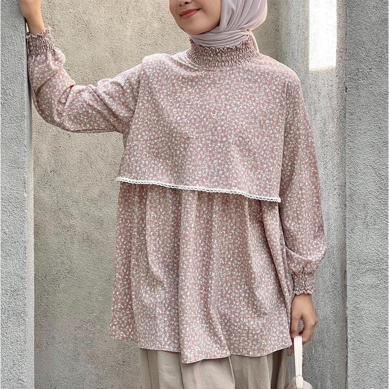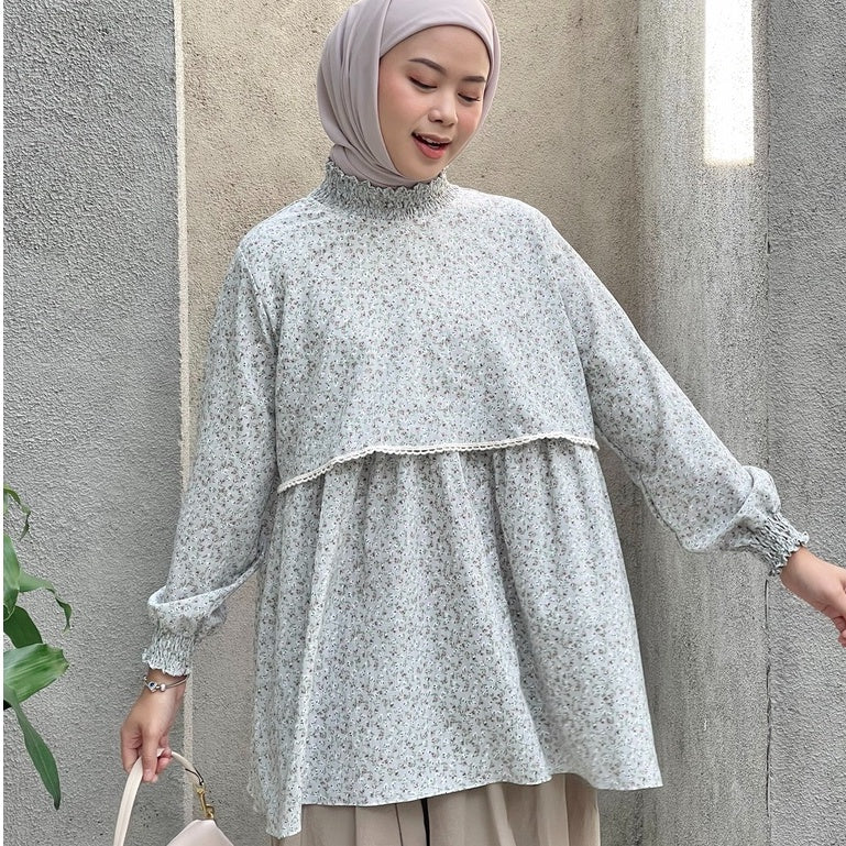 Blouse dengan siluet A-line yang jatuh lebut, cocok untuk acara formal. Paduan kerah dan manset smock elastis memberi sentuhan rapi sekaligus nyaman, sementara aksen list renda putih di garis dada menambahkan detail manis tanpa berlebihan.